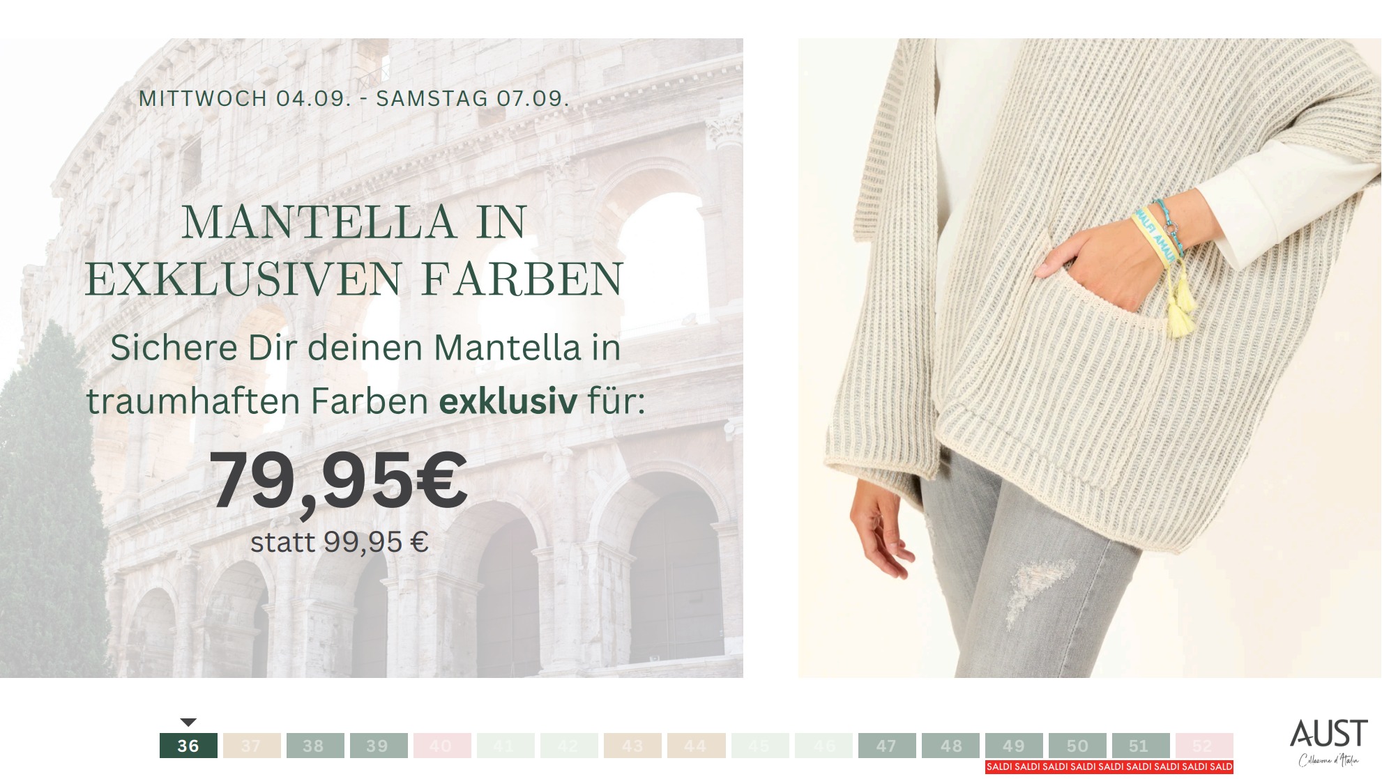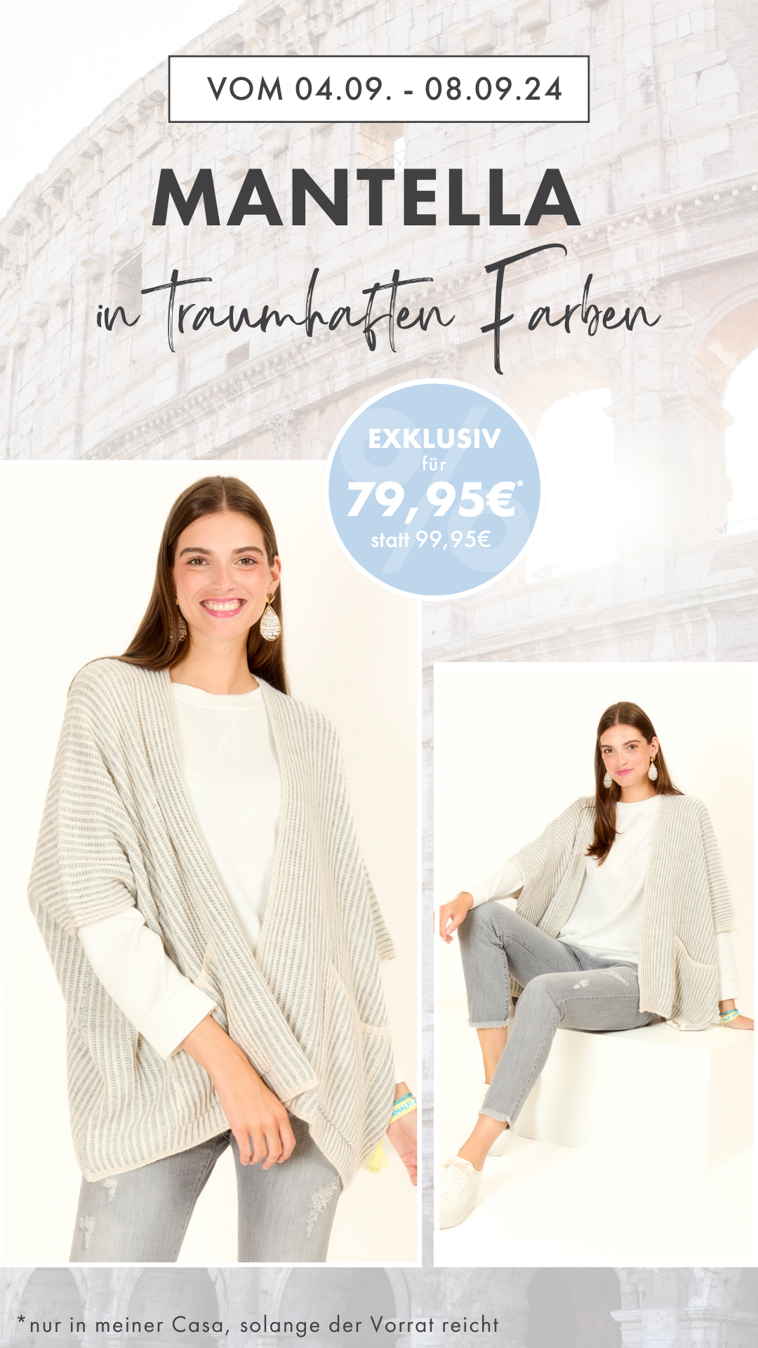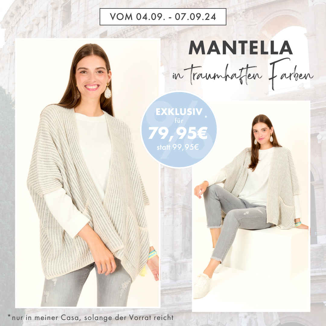 Die Mantella ist mehr als nur ein Kleidungsstück; sie ist ein Ausdruck von Tradition, Luxus und dem unvergleichlichen italienischen Lebensgefühl. Und genau dies könnt Ihr genau in dieser Woche mit euren Kundinnen feiern! Wir bringen die Mantella zu euch – in 2 tollen Farben und zu einem Knaller-Preis!