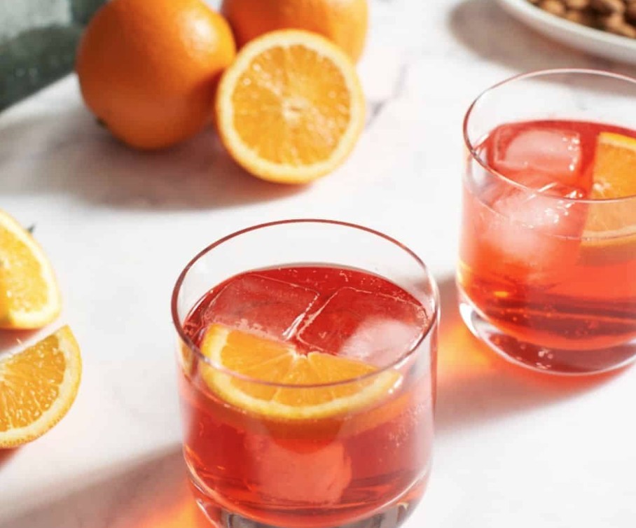 - Negroni: Ein kräftiger Cocktail aus Gin, rotem Wermut und Campari, serviert auf Eis mit einer Orangenschale.