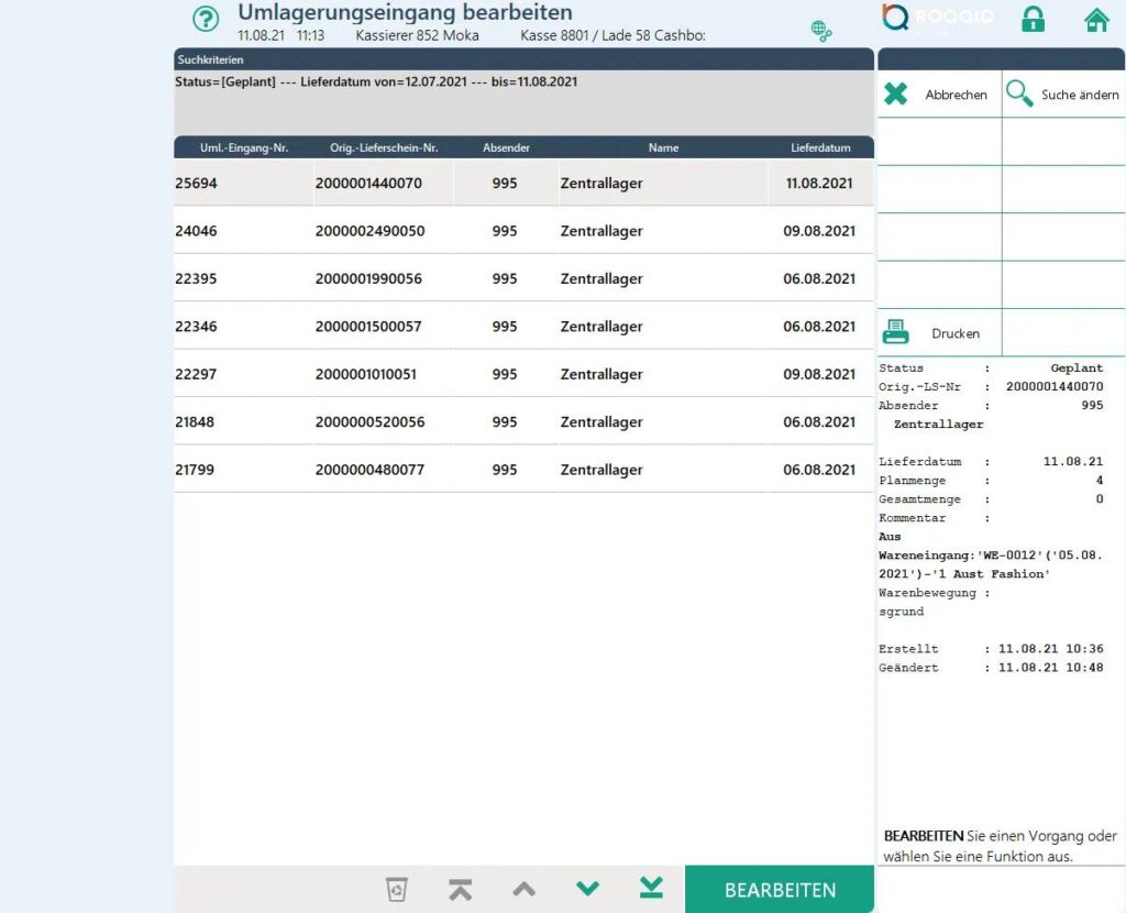 2. Klicke bspw. auf Umlagerungseingang – alle Vorgänge werden dir angezeigt