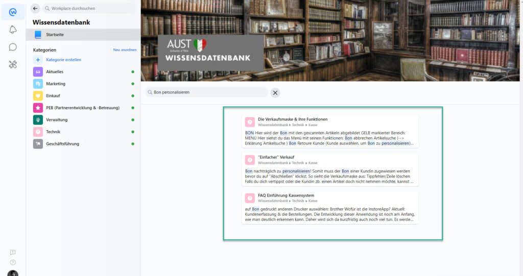 3. Die gesamte Wissensdatenbank wird nach dem Suchbegriff durchsucht und die Ergebnisse werden dir angezeigt. Die Suche bezieht sich ausschließlich auf die Inhalte der Wissensdatenbank (Gruppen, Chats usw. werden in diesem Fall nicht durchsucht)