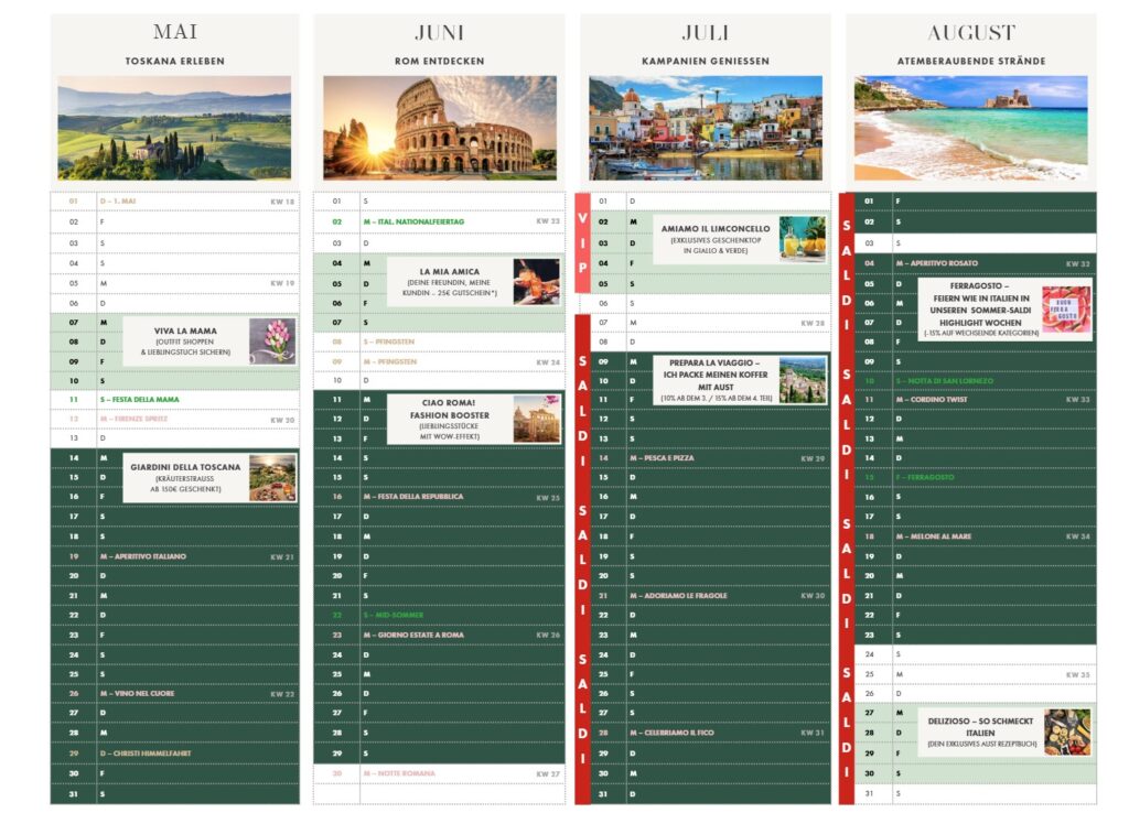 Jeder Monat bringt seine ganz eigene Stimmung, neue Lieblingsaktionen & frische Impulse – immer mit dabei: echte Dolce-Vita-Momente, starke Aktionsideen und ganz viel italienische Lebensfreude.