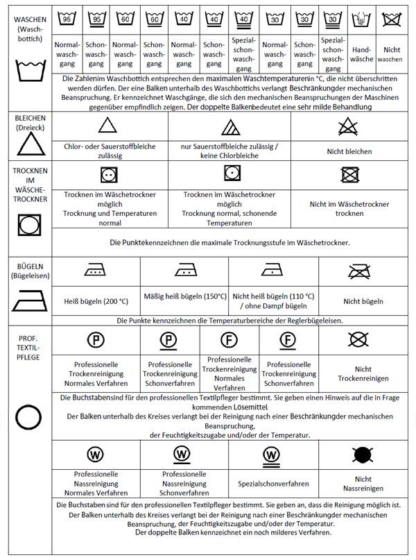 In der folgenden Übersicht findest du die gängisten Symbole der Textilpflege & deren Bedeutung