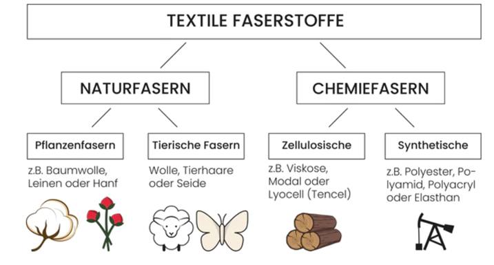 Es wird unterschieden in Pflanzenfasern, Tierfasern und chemische Fasern. Die bekanntesten Vertreter der Pflanzenfasern sind Baumwolle, Leinen, Hanf. Bei den Tierischen Fasern sind es Schurwolle, Kaschmir und Seide.
