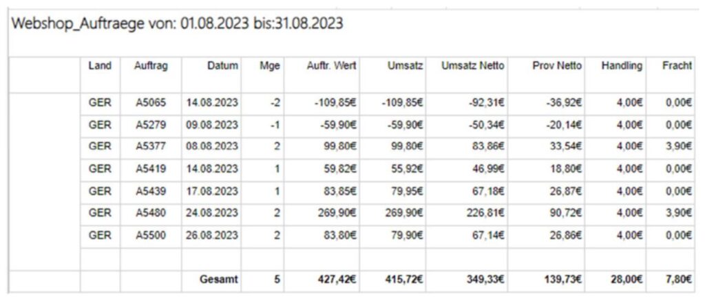 4. Menge= Dies ist die Menge der Artikel in der Bestellung, findest du hier ein Minus vor dem Betrag handelt es sich um eine Retoure